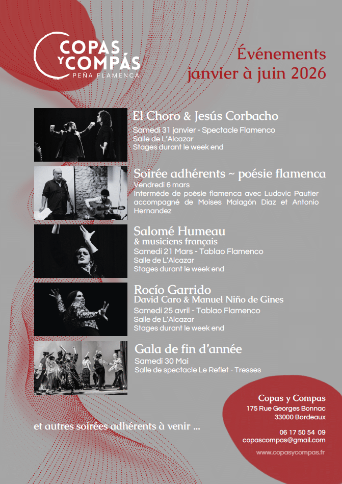 - Samedi 21 mars : Tablao qui mettra à l’honneur des artistes français, avec une jeune danseuse anciennement bordelaise, qui développe maintenant une carrière en Espagne : Salome Humeau. Comme d’habitude, des stages seront proposés durant le week-end.