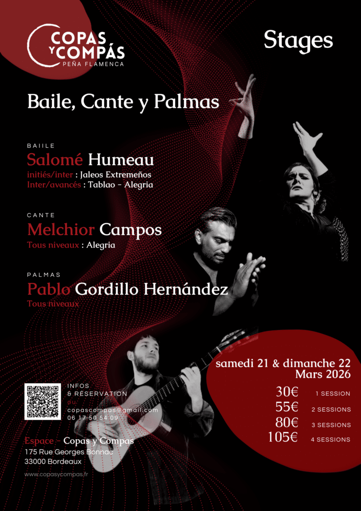 Les stages se dérouleront comme d’habitude à la Peña. Nous profitons de la venue de Salomé et de son équipe pour vous proposer des stages un peu différents et tirer parti du fait qu’ils parlent français afin d’approfondir certains palos ainsi que des aspects plus subtils de la scène flamenca.
