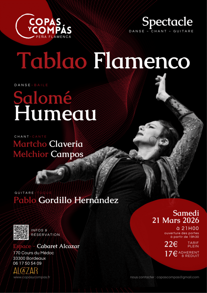 L’entrée est à 17 € pour les adhérents et de 22 € pour les non adhérents (afin de s’acquitter d’une adhésion temporaire de 5€). Un tarif réduit à 17 € est proposé aux étudiants, intermittents, personnes en recherche d’emploi, ainsi qu’aux stagiaires de ce week-end. Comme d’habitude, les réservations se font via Helloasso, il suffit de cliquer sur le lien suivant : Billetterie – Tablao Salomé Humeau.